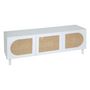Ce meuble TV Cabras au design épuré combine modernité et charme naturel. Il est composé d'une structure rectangulaire blanche, simple et élégante, soutenue par quatre pieds cylindriques. La particularité de ce meuble réside dans ses trois portes en cannage naturel, insérées dans des cadres blancs av