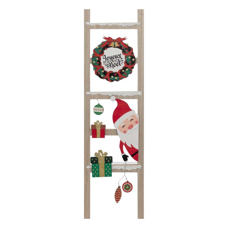 Pancarte échelle Joyeux Noël en bois avec Père Noël et couronne - H 65 cm