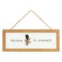 Informations Techniques : Dimensions : L. 38 x l. 2 x H. 15 cm Matières : MDF & Chanvre Spécificités : Déco & Tendance Pancarte murale à suspendre Inscription Believe in yourself Design avec véritable plume Poids : 0,42 kg Couleur : Naturel