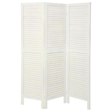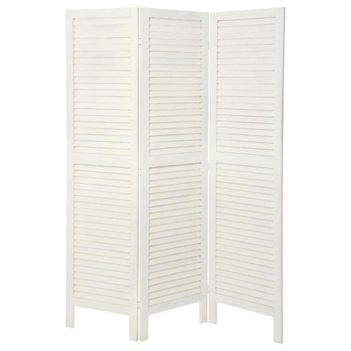 Informations Techniques : Dimensions : Déplié : L. 120 x l. 2 x H.170 cm Plié : L. 40 x l. 6 x H.170 cm Matière : Bois (Paulownia) Spécificités : Authentique & Pratique Paravent 3 panneaux Effet porte persienne Structure pliable Poids : 4,9 kg Couleur : Blanc