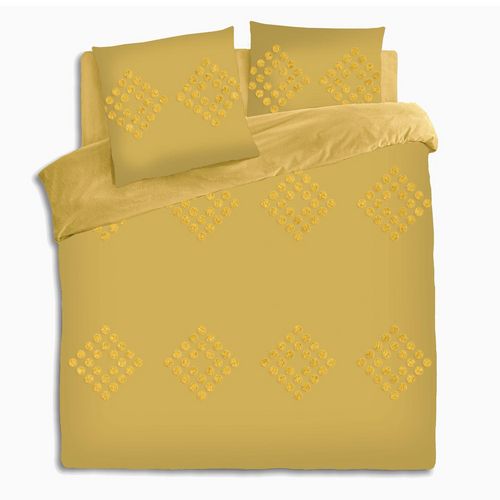 Nous vous proposons cette parure de lit en coton de la collection Tuft.FICHE TECHNIQUE- Parure de Lit- Couleur Ocre.- Nombre de fils/cm² : 60- Détail losange en pompon rasé.- Comprends 1 housse de couette et 2 housses d'oreiller.- Modèle 100% coton.- Housse de couette avec fermeture en boutons invis