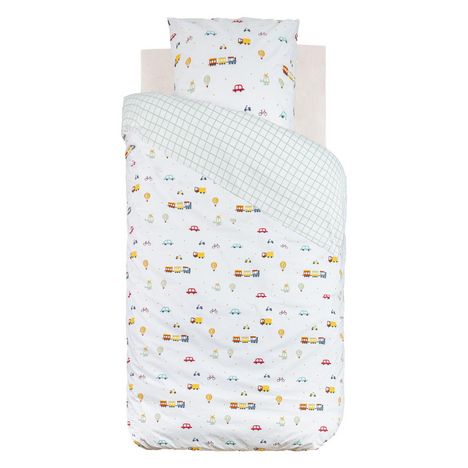 Direction les rêves à toute vitesse avec cette parure de lit réversible sur le thème des voitures et autres transports. Composée d'une housse de couette et d'une taie d'oreiller, elle présente un imprimé ludique et coloré qui plaira aux petits passionnés d'automobiles. Son verso uni à carreaux perme