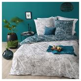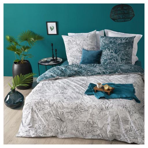 Parure housse de couette + taies d'oreiller en toile pur coton tissée bien serré, douce au toucher, confortable et résistante. Un superbe feuillage de jungle dessiné au trait, et un linge de lit réversible pour multiplier les combinaisons... on adore ! Housse de couette à base droite boutonnée.