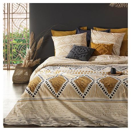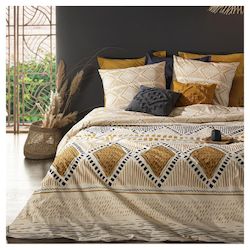 Parure housse de couette + taies d'oreiller en toile pur coton tissée bien serré, douce au toucher, confortable et résistante. Un motif inspiré des kilims, des couleurs épicées chaleureuses à souhait... un linge de lit d'esprit ethnique, comme une invitation à de beaux voyages immobiles.