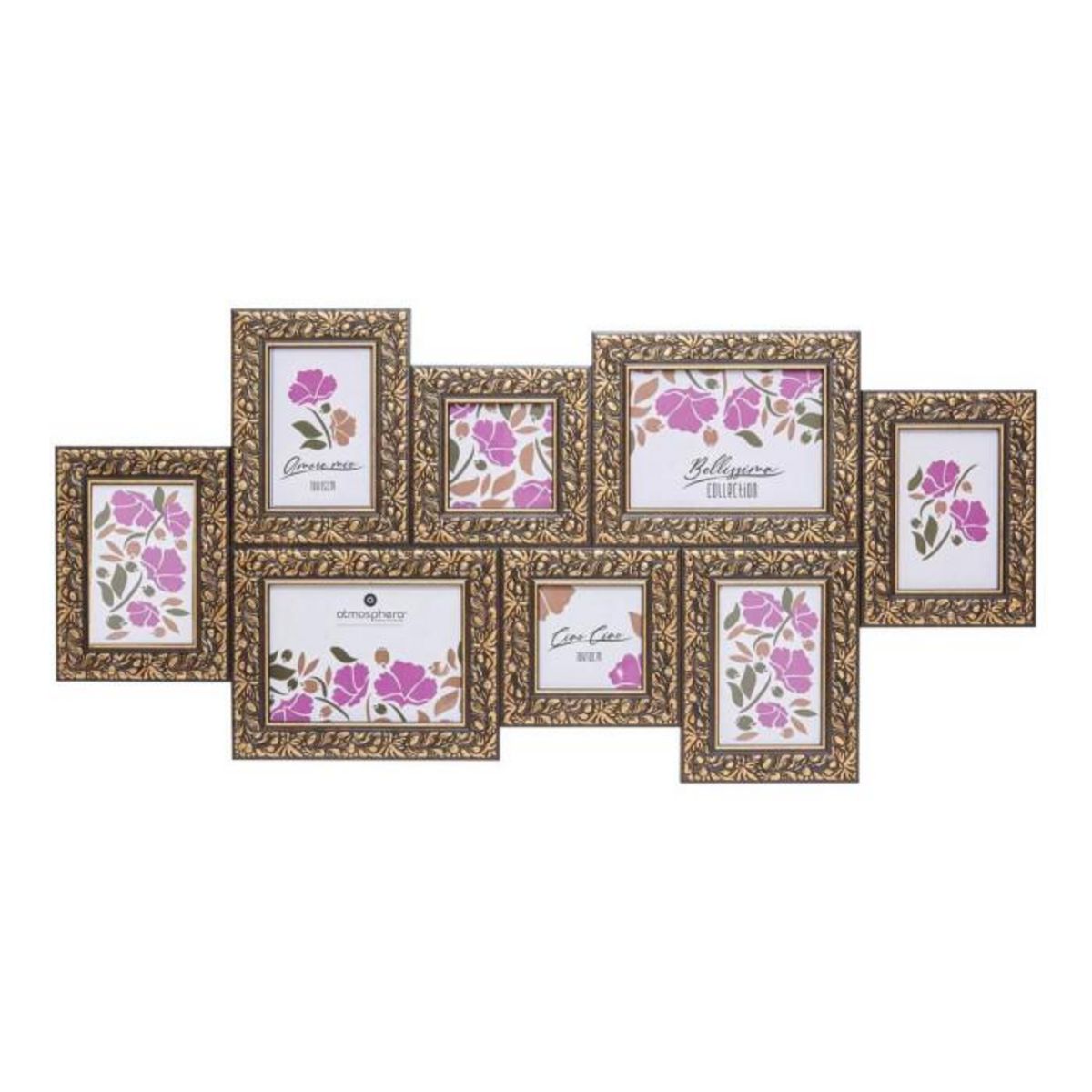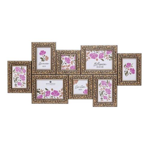Informations Techniques : Dimensions : L. 87,5 x l. 1,8 x H. 40 cm Matières : Polystyrène & Verre Spécificités : Fantaisie & Déco Pêle-mêle mural 8 photos Cadre aux motifs dorés Format photo 13x18, 10x15 et 10x10 cm Poids : 1,9 kg Couleur : Noir