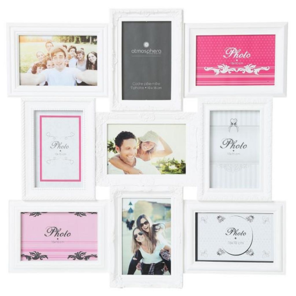 Informations Techniques : Dimensions : L. 50 x l. 50 cm Photo : L. 10 x l. 15 cm Matières : Plastique, Verre & Carton Spécificités : Pêle-Mêle déco 9 Photos Style Romantique A suspendre Sens d'accroche Verticale Poids : 1,3 kg Couleur : Blanc
