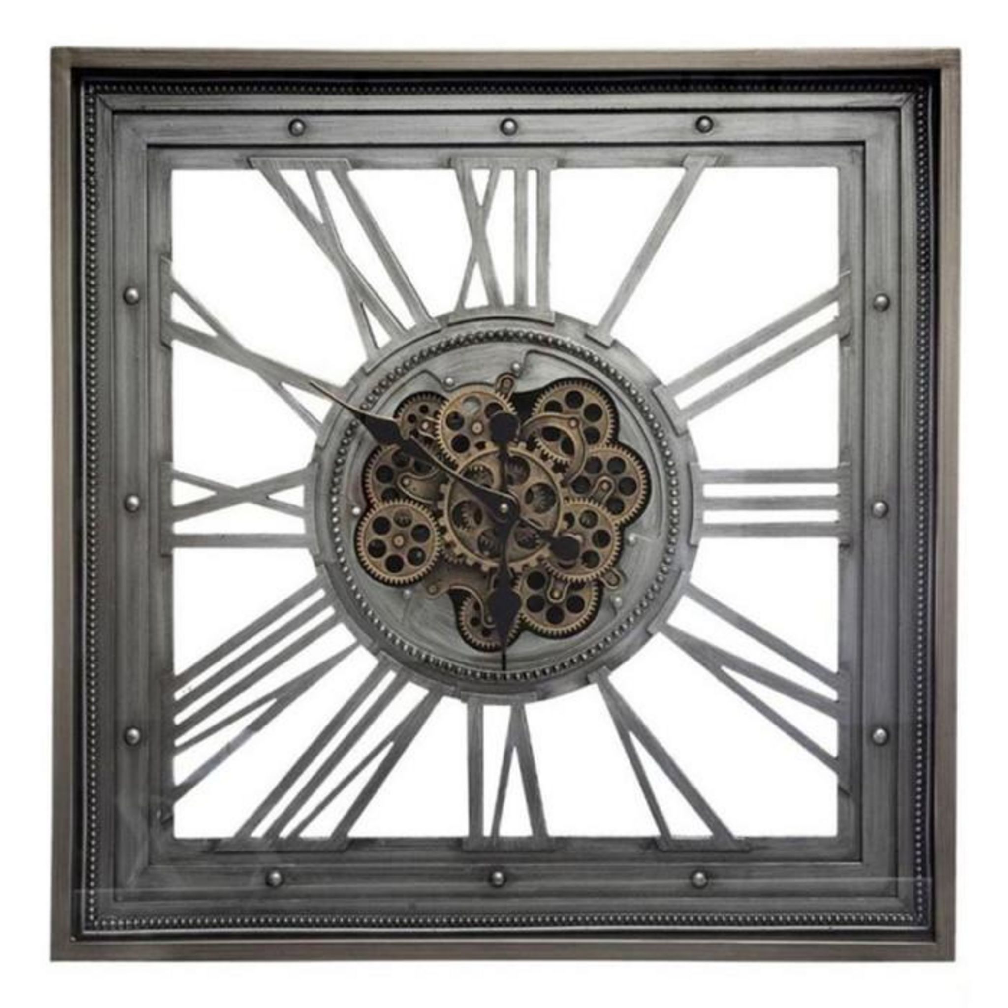 Informations Techniques : Dimensions : L. 80 x l. 11 x H. 80 cm Matières : Fer, Verre & ABS Spécificités : Horloge à suspendre Mécanisme électrique Fonctionne avec des piles AA/LR6 non incluses Pendule carrée silencieuse Mécanisme en mouvement Jibang 8838 Poids : 15 kg Couleur : Gris