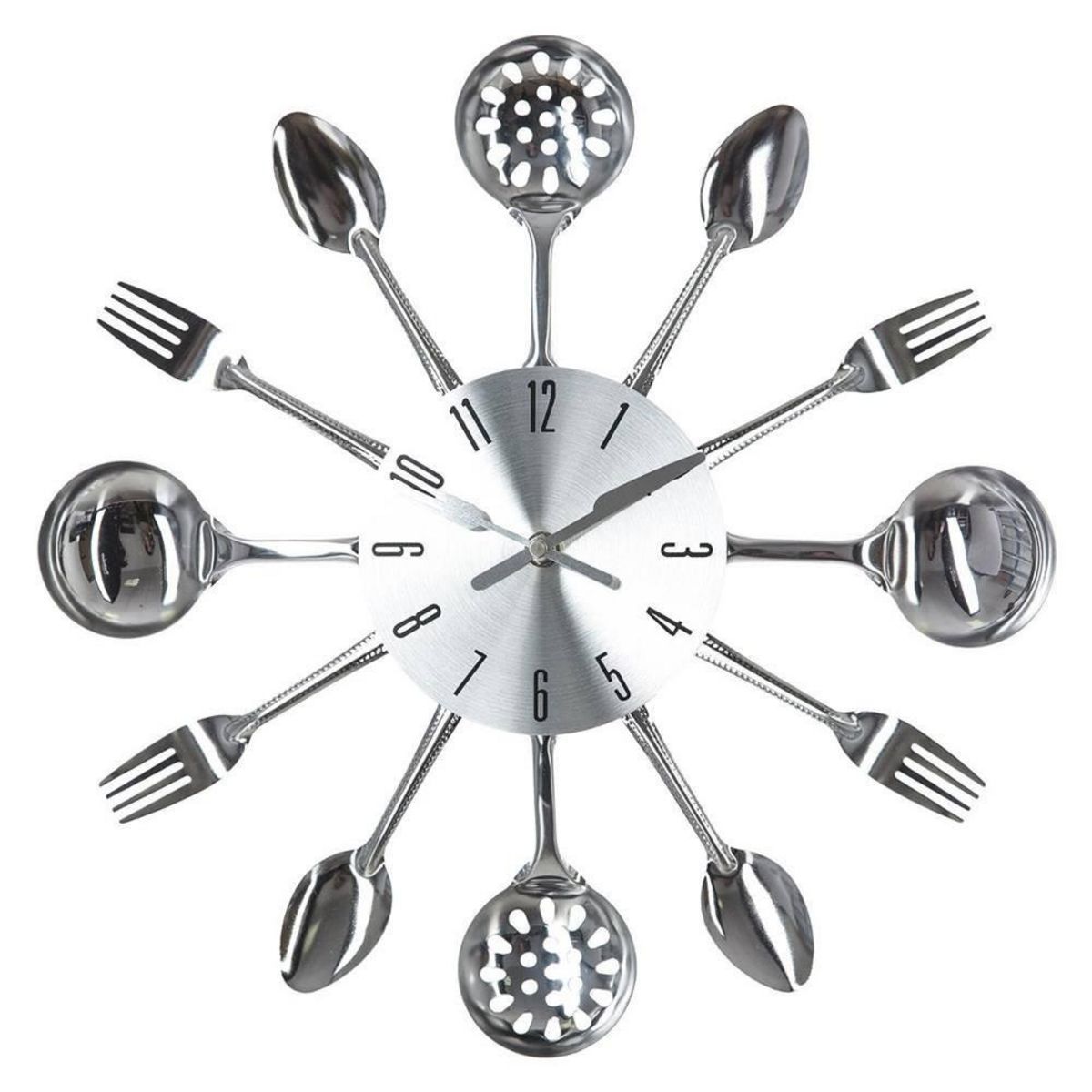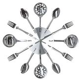 Pendule Métal Ustensiles Ø38cmAmbiance chic sobre avec cette belle pendule en métal ustensiles de 38 cm de diamètre.Originale et terriblement chic, cette toute nouvelle horloge murale à l'esprit chromé éveillera la curiosité de vos visiteurs. Son style métallique étoilé parsemé d'ustensiles de cuisi