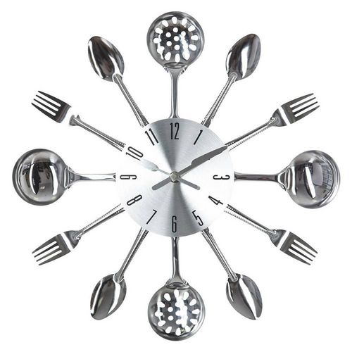 Pendule Métal Ustensiles Ø38cmAmbiance chic sobre avec cette belle pendule en métal ustensiles de 38 cm de diamètre.Originale et terriblement chic, cette toute nouvelle horloge murale à l'esprit chromé éveillera la curiosité de vos visiteurs. Son style métallique étoilé parsemé d'ustensiles de cuisine fera sans nul doute bonne figure dans votre cuisine ou votre salle à manger.Fonctionne avec une pile LR06/AA non incluse. Pendule à usage exclusivement intérieur.Informations sur la pendule métal ustensiles :Dimensions : diamètre 38 cmPoids : 0,5 kgCouleur : effet aluminium brossé