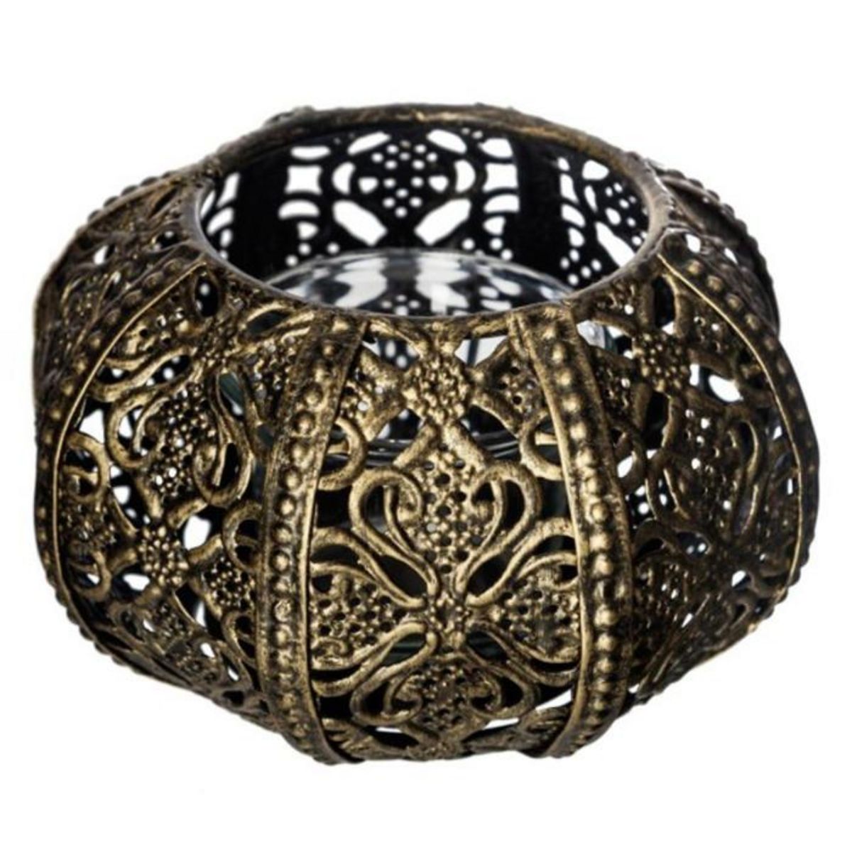 Informations Techniques : Dimensions : D. 11 x H. 8,5 cm Bougie Verre : D. 3,5 x H. 5 cm Matières : Fer & Verre Spécificités : Tendance & déco Photophore Ajouré Poids : 0,2 kg Couleur : Or
