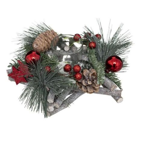 Informations Techniques : Dimensions : D. 20 x H. 8 cm Verre : D. 4,4 x H. 6,3 cm Matière : Bois Spécificités : Pratique & Utile Photophore Déco Centre de Table Design Branches, Feuilles de Houx & Pommes de Pin Poids : 0,28 kg Couleur : Vert & Naturel