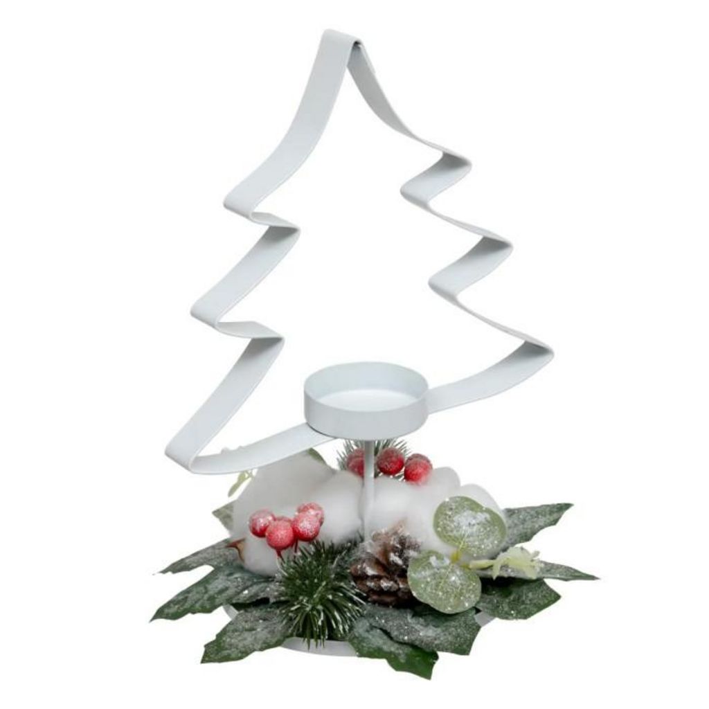 Informations Techniques : Dimensions : L. 20 x l. 18 x H. 25 cm Matière : Acier Spécificités : Festif & Utile Photophore sur socle Design sapin de Noël Poids : 0,22 kg Couleur : Blanc