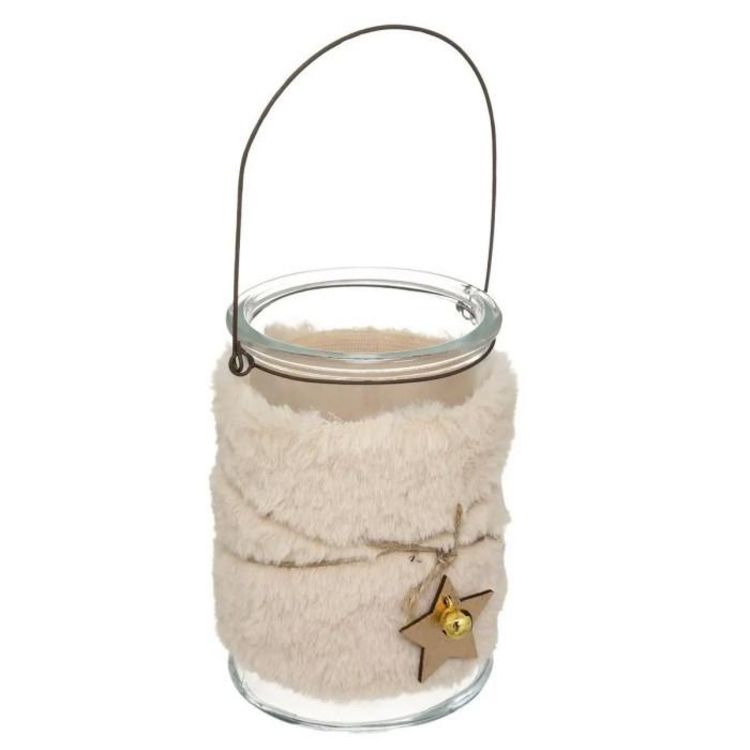 Informations Techniques : Dimensions : D. 10 x H. 14 cm Matière : Verre Spécificités : Pratique & Utile Photophore Design Forme Ronde Avec Anse Texture Imitation Fourrure Design Étoile Poids : 0,475 kg Couleur : Beige
