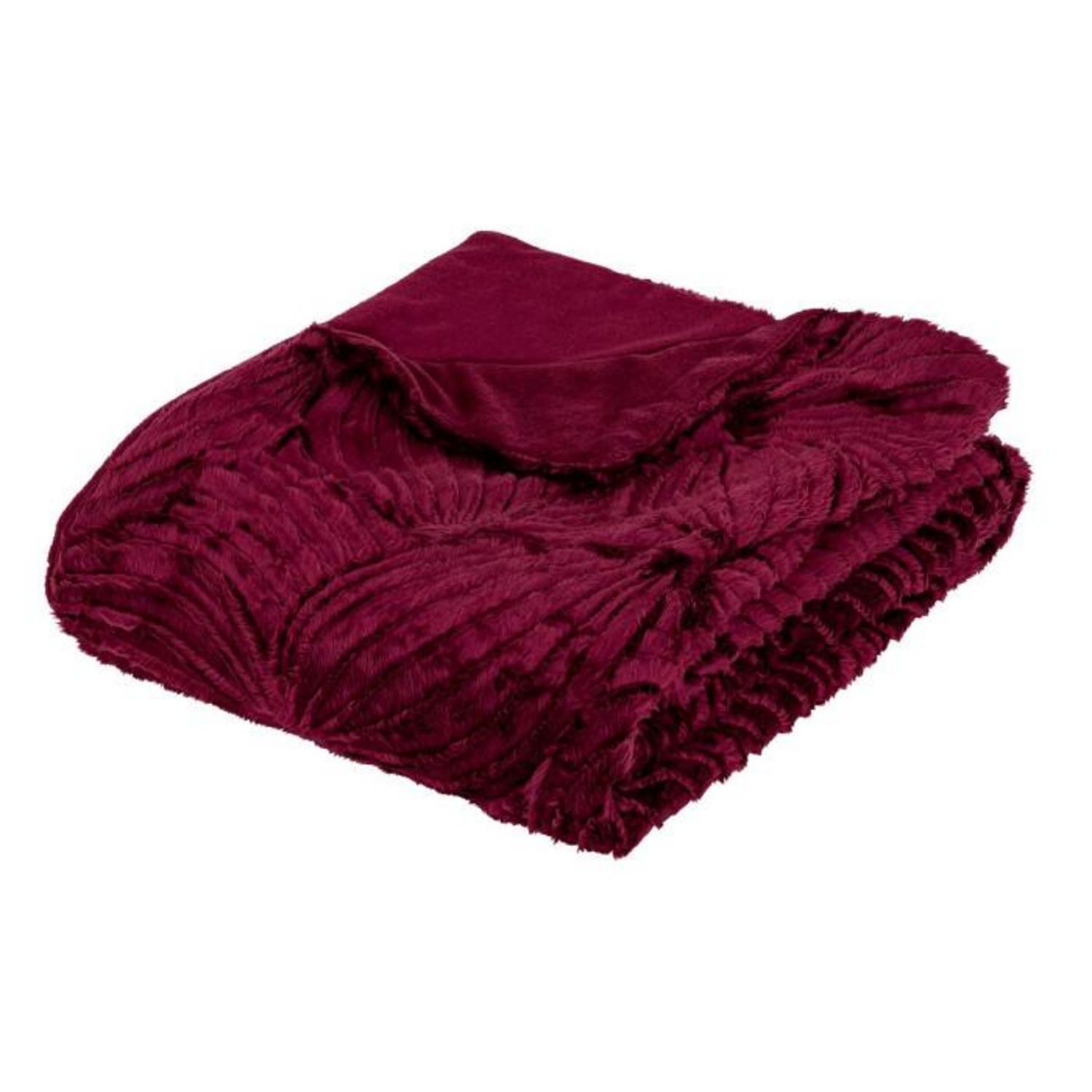 Informations Techniques : Dimensions : L. 160 x l. 120 x H. 1 cm Matière : Polyester Spécificités : Doux & Chaud Plaid imitation fourrure Motif relief ton sur ton Lavable en machine à 30° Certification Oeko-Tex Poids : 0,85 kg Couleur : Rouge Rubis