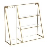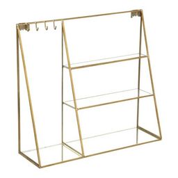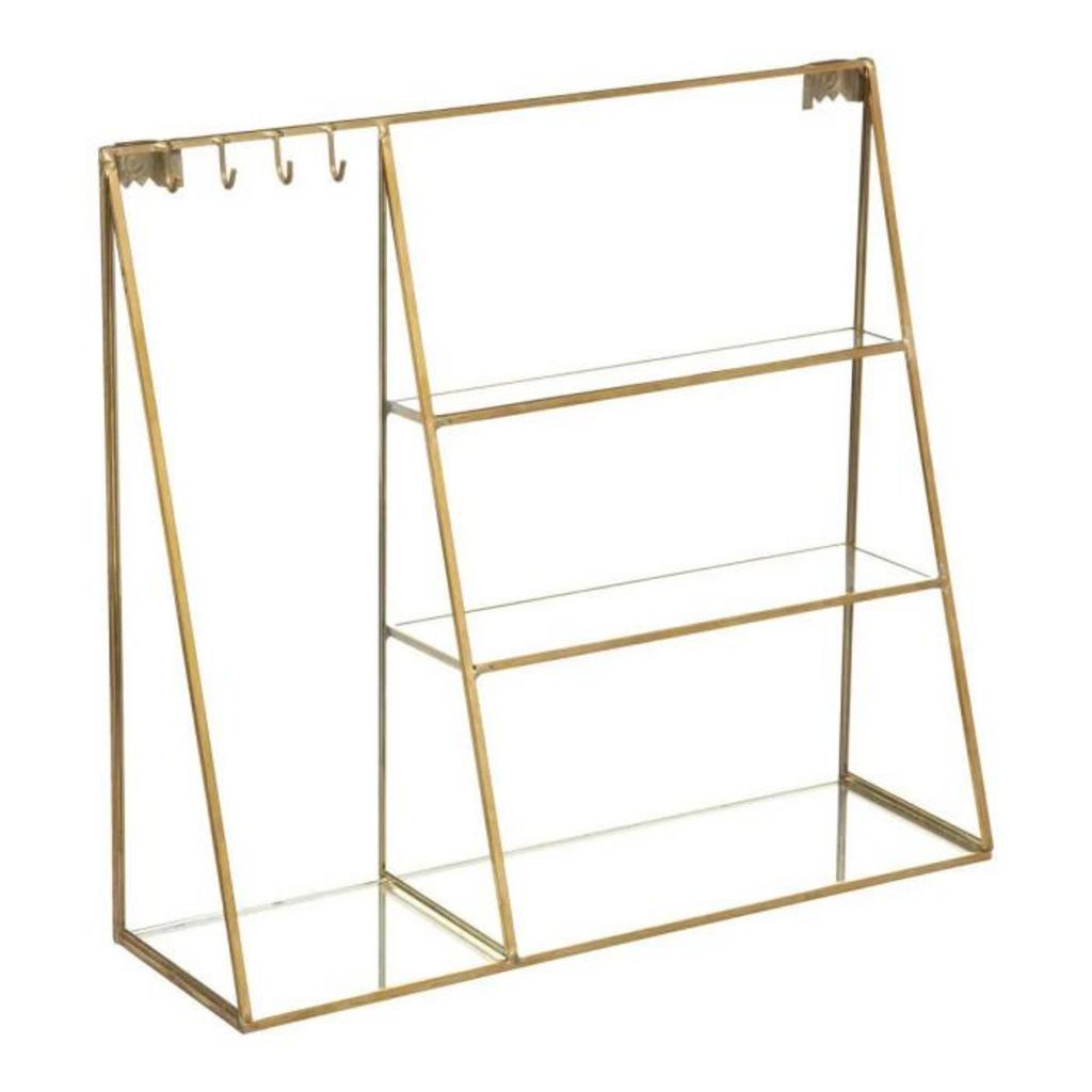 Informations Techniques : Dimensions : L. 30 x l. 9,5 x H. 27 cm Matières : Laiton & Verre Spécificités : Pratique & Utile Porte-Bijoux Mural Nombreux Rangements Poids : 1,16 kg Couleur : Or
