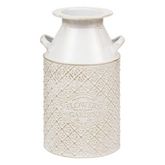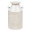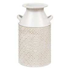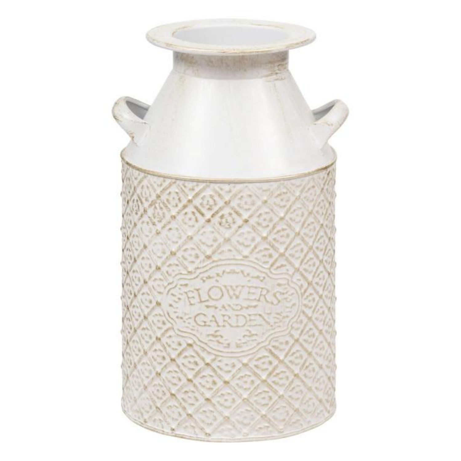 Informations Techniques : Dimensions : D. 17,5 x H. 31,5 cm Matière : Métal Spécificités : Déco & Robuste Pot à lait avec 2 anses Inscription Flowers and garden Motifs dorés Finition patine Poids : 0,52 kg Couleur : Blanc