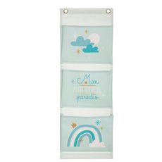 Rangement enfant 3 pochettes bleuVotre enfant va adorer ce système de rangement mural 3 pochettes original et trop mignon composé de 3 pochettes souples de différentes tailles avec l'inscription Mon petit paradis . Ces pochettes fixées au mur permettront de ranger tous ses petits objets et affaires.Informations sur le rangement enfant 3 pochettes bleu :Dimensions : L. 18,5 x l. 0,3 x H. 55 cmPoids : 150 gComposition : coton, polyester, polyéthylène2 œillets de fixation