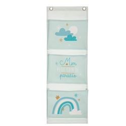Rangement enfant 3 pochettes bleuVotre enfant va adorer ce système de rangement mural 3 pochettes original et trop mignon composé de 3 pochettes souples de différentes tailles avec l'inscription Mon petit paradis . Ces pochettes fixées au mur permettront de ranger tous ses petits objets et affaires