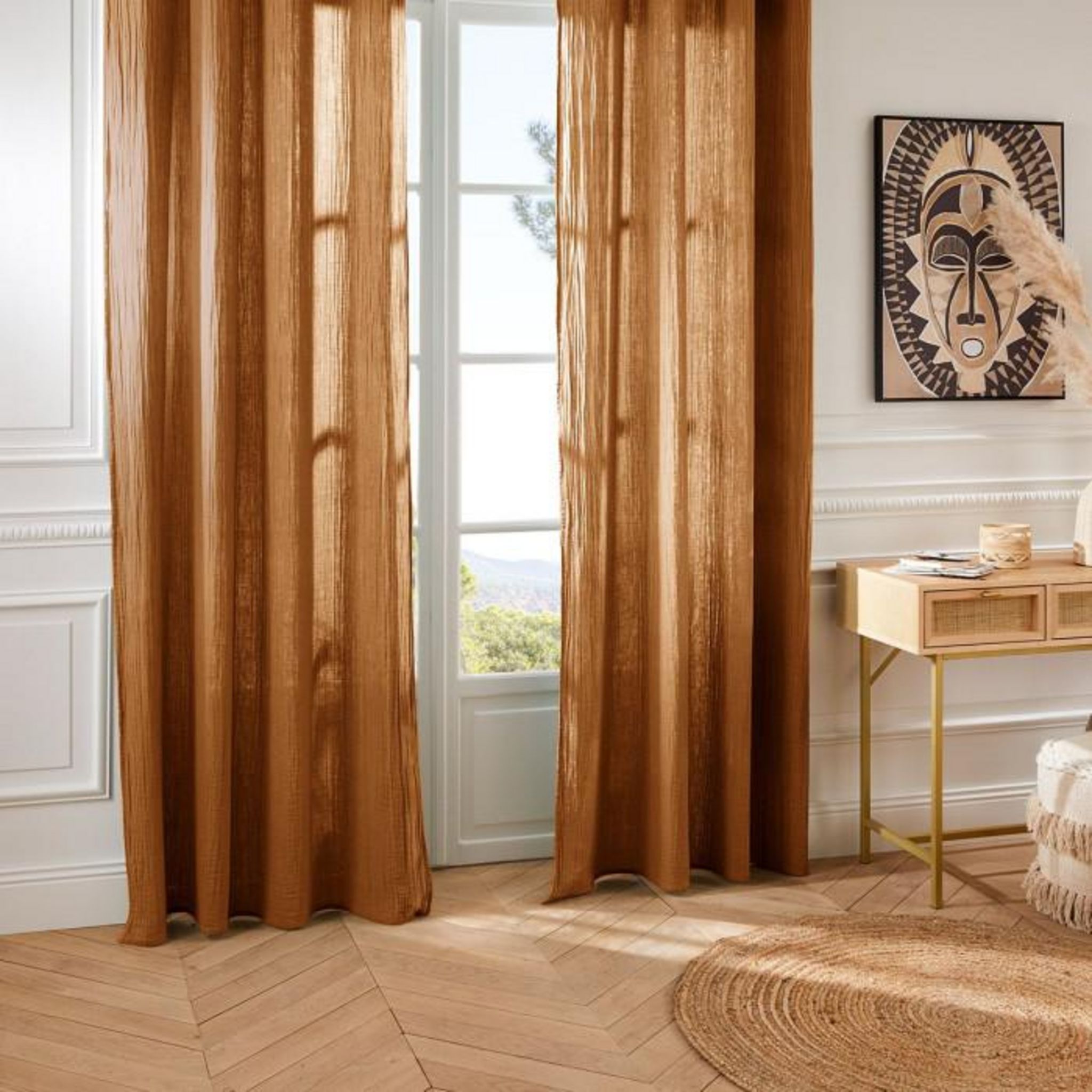 Informations Techniques : Dimensions : L. 130 x l. 0,5 x H. 260 cm Matières : Coton (Gaze de coton) & Cuivre Spécificités : Pratique & Tendance Rideau à oeillets 8 oeillets Forme rectangulaire Poids : 0,59 kg Couleur : Cannelle