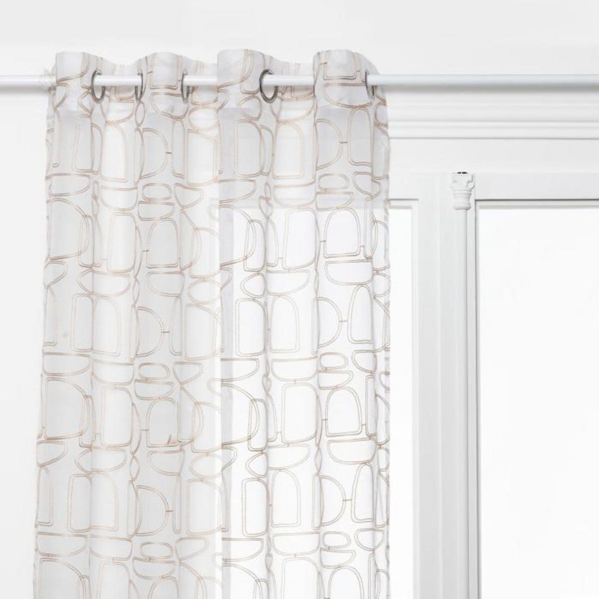 Informations Techniques : Dimensions : L. 140 x l. 0,5 x H. 240 cm Matière : 100% polyester Spécificités : Élégant & Déco Rideau voilage Motifs brodés Avec 8 œillets Certification Oeko-Tex Poids : 0,33 kg Couleur : Beige & Blanc