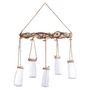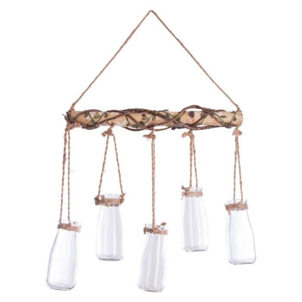 Informations Techniques : Dimensions : L. 40 x P. 6,5 x H. 65 cm Matières : Verre, Bois & Jute Spécificités : Soliflore 5 têtes Elément à suspendre Poids : 1,515 kg Couleur : Naturel