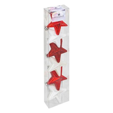 Informations Techniques : Dimensions : L. 6,3 x l. 3 x H. 6,5 cm Matière : Polystyrène Recyclé Spécificités : Déco & Festif Sujet de Noël à accrocher Design étoile Avec 2 couleurs différentes Finitions : brillante, pailletée, irisée et mate Poids : 0,02 kg Couleur : Rouge & Blanc