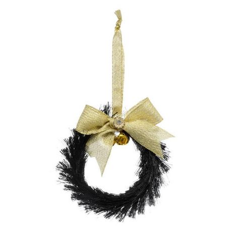 Informations Techniques : Dimensions : L. 10 x l. 1 x H. 10 cm Matières : Polyester & Métal Déco & Festif Sujet de Noël couronne Avec nœud À suspendre Poids : 0,02 kg Couleur : Or