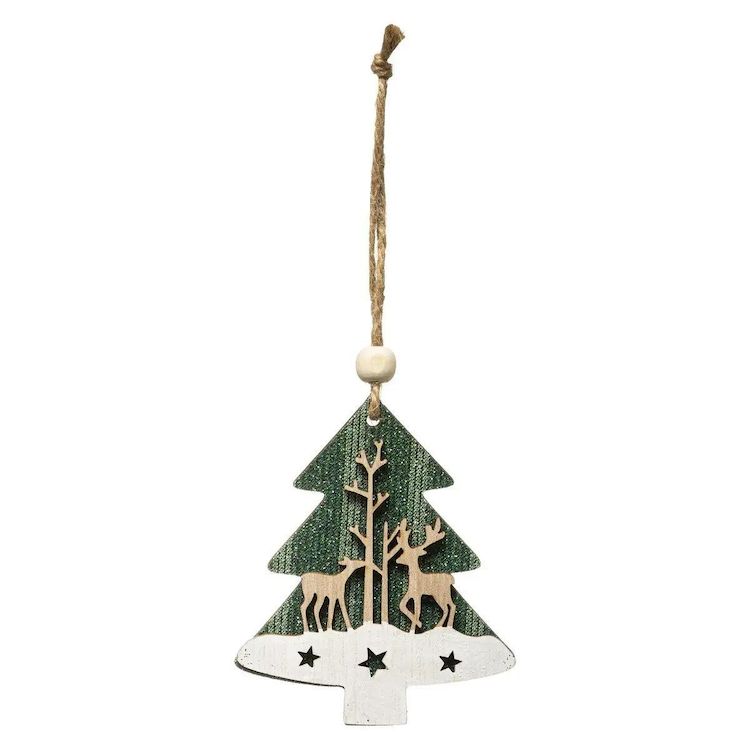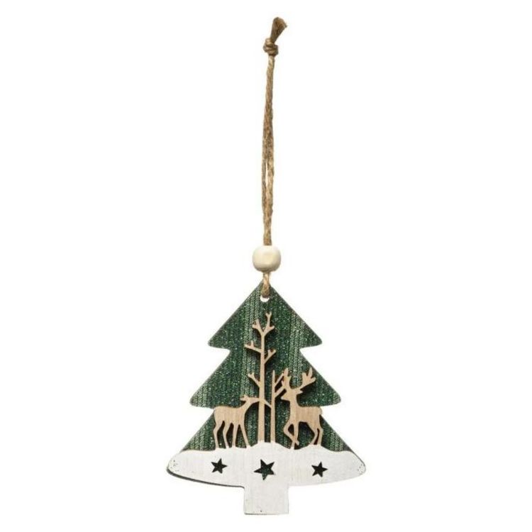 Informations Techniques : Dimensions : L. 9,2 x l. 0,5 x H. 18 cm Matière : Contreplaqué Spécificités : Pratique & Utile Sujet de Noël A Suspendre Design Sapin Poids : 0,011 kg Couleur : Vert & Blanc