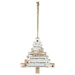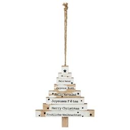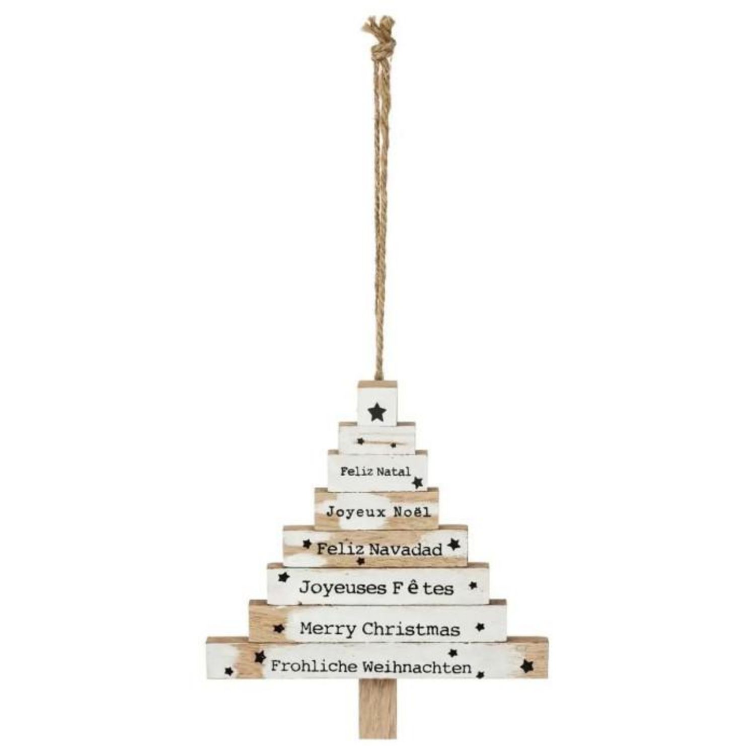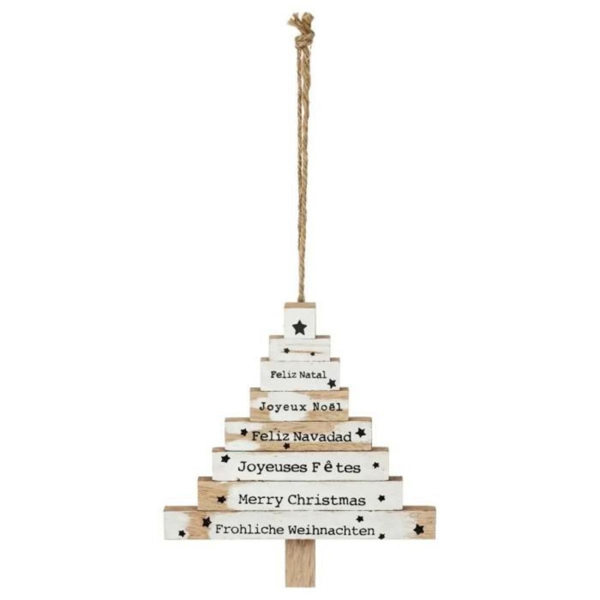 Informations Techniques : Dimensions : L. 14 x l. 15 cm Matière : Bois Spécificités : Pratique & Utile Sujet de Noël A Suspendre Design Sapin 8 Pancartes Joyeux Noël écrit en 5 Langues différentes Poids : 0,067 kg Couleur : Blanc & Beige