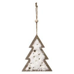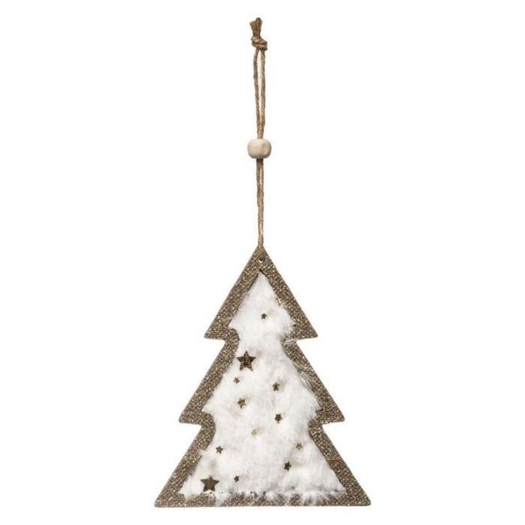Informations Techniques : Dimensions : L. 9,8 x l. 0,5 x H. 21 cm Matière : Contreplaqué Spécificités : Pratique & Utile Sujet de Noël A Suspendre Design Sapin Avec Fourrure Blanche & Étoiles Dorées Bordure avec Pailletttes Poids : 0,012 kg Couleur : Blanc & Naturel