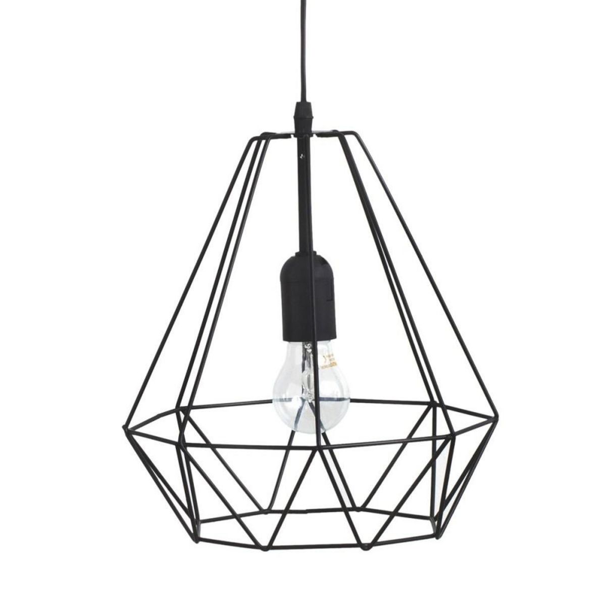 Suspension métal filaire D26 noirDécouvrez cette magnifique suspension géométrique en métal noir dans un style filaire très contemporain.D'un diamètre de 26 cm pour 29 cm de hauteur, cet éclairage de plafond avec sa structure au design filaire simple s'intégrera parfaitement dans bon nombre d'intéri