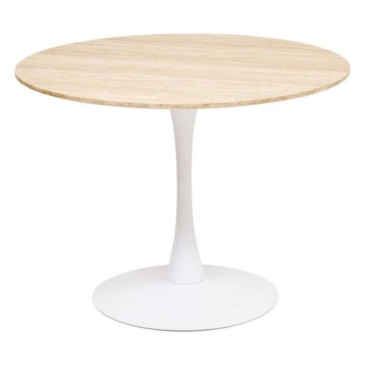 Informations Techniques : Dimensions : D. 102 x H. 76 cm Matières : Acier & MDF Spécificités : Tendance & Pratique Table de repas ronde Jusqu'à 4 personnes Placage effet travertin Certifié FSC À monter soi-même Poids max supporté : 65 kg Poids : 20,7 kg Couleur : Naturel & Blanc