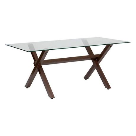 Informations Techniques : Dimensions : L. 180 x l. 90 x H. 74,5 cm Matières : Plateau : Verre Trempé Piètement : Acier Spécificités : Solide & Élégante Table de repas rectangulaire Plateau en verre trempé Piètement en métal effet noyer À monter soi-même Poids : 53 kg Couleur : Transparent & Marron