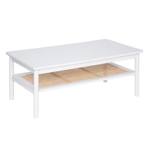 Informations Techniques : Dimensions : L. 109,8 x l. 60 x H. 45,5 cm Matières : Étagère : MDF & Rotin Plateau : MDF Piètement : Bois (Héva) Spécificités : Épurée & Esthétique Table basse rectangulaire Tablette avec cannage en rotin À monter soi-même Poids : 14,64 kg Couleur : Blanc