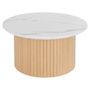 Vous aimez les meubles modernes qui mélangent les matières ? Alors, la table basse Homelya va vous plaire. Cette table basse ronde est confectionnée en fibres de bois avec une structure en acier. La large base représente des lattes de bois avec un placage en papier. Ainsi, elle soutient un plateau circulaire avec un placage imitation marbre. Ce joli mélange de matières trouvera naturellement sa place dans un salon contemporain. La table basse Homelya sera bien mise en valeur près d'un canapé dans une teinte neutre avec un tapis en jute.