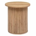 Informations Techniques : Dimensions : D. 45 x H. 50 cm Matières : Plateau : MDF Piètement : Bois (Contreplaqué) & MDF Spécificités : Design & Utile Lattes verticales Forme ronde À monter soi-même Poids : 11,34 kg Couleur : Beige