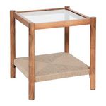 Informations Techniques : Dimensions : L. 50 x l. 50 x H. 55 cm Matières : Verre, Jute & Acacia Spécificités : Pratique & Tendance Table d'appoint Plateau en verre trempé Étagère tressée en jute A monter soi-même Forme carrée Poids : 11 kg Couleur : Marron