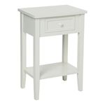 Informations Techniques : Dimensions : L. 45 x l. 30 x H. 67 cm Matières : Bois (Pin) & MDF Spécificités : Classique & Vintage Table de Chevet 2 Niveaux 1 Tiroir A monter soi-même Poids : 6,5 kg Couleur : Blanc