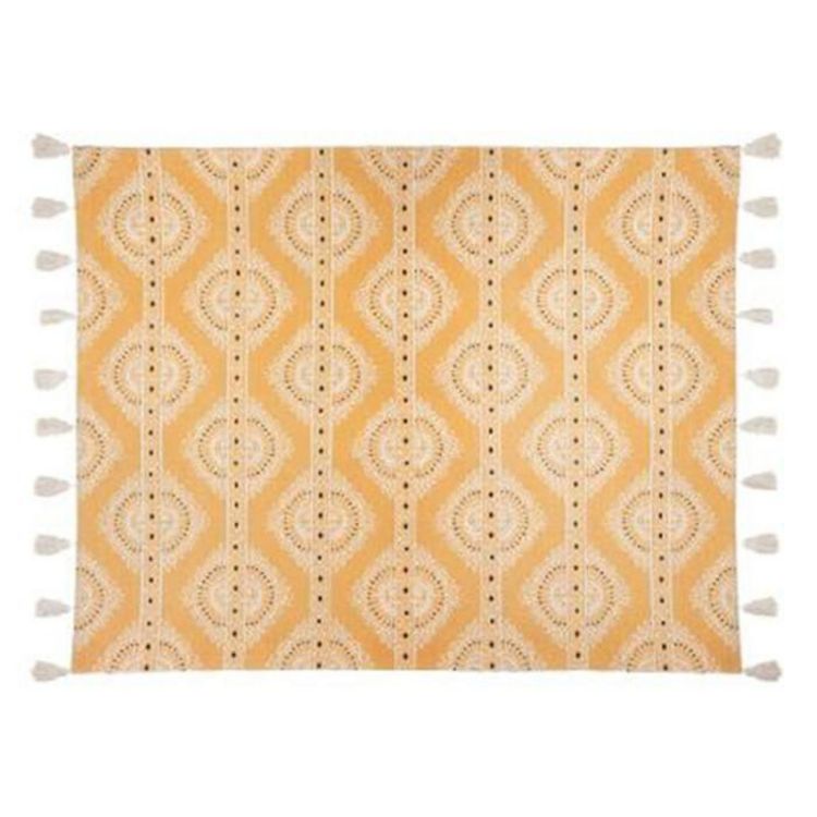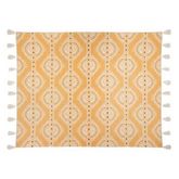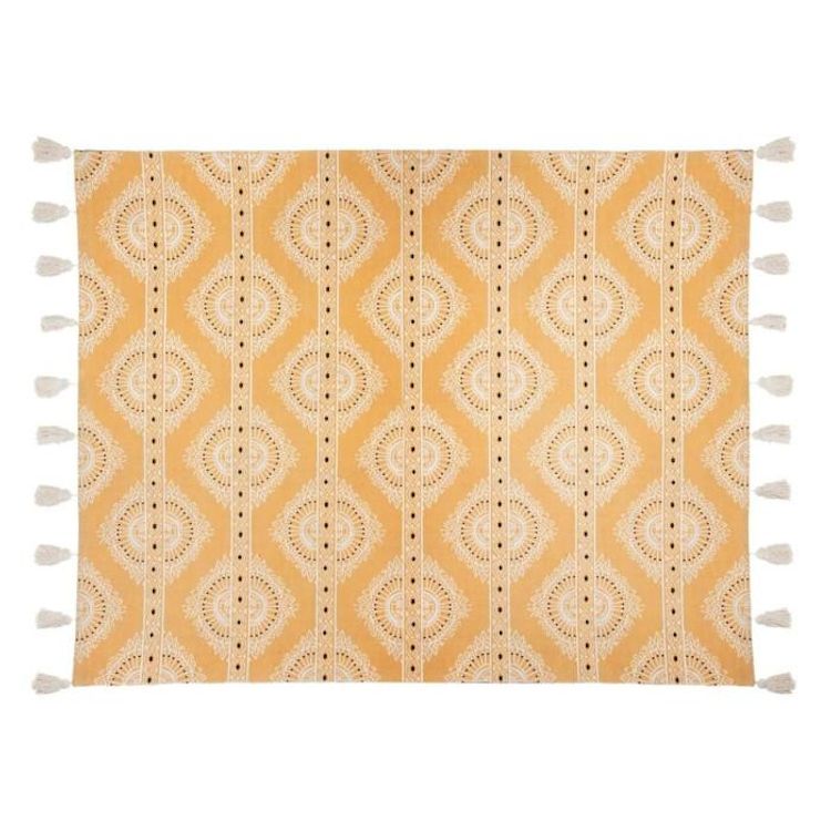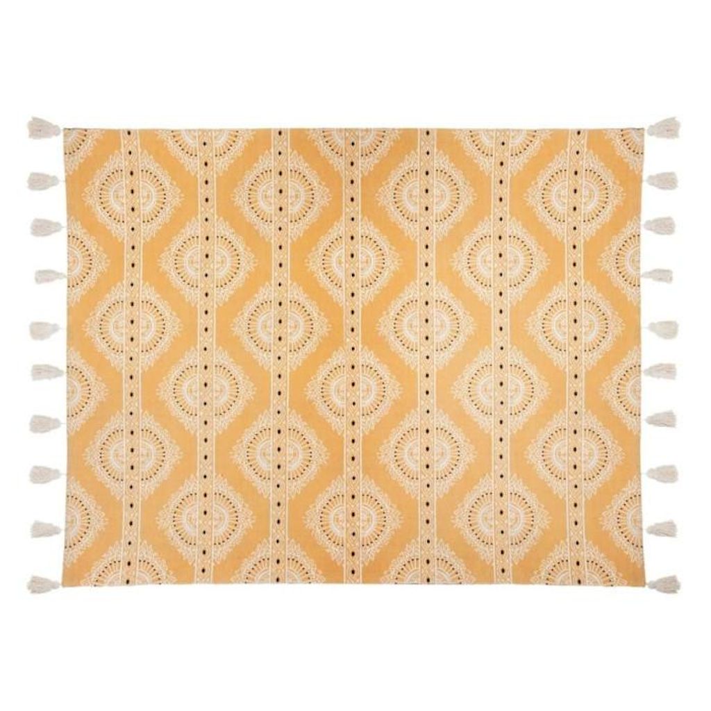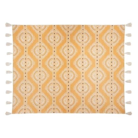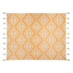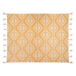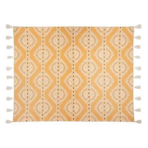 Informations Techniques : Dimensions : L. 170 x l. 120 x H. 1 cm Matières : Coton, Polyester & Viscose Spécificités : Déco & Tendance Tapis design Forme Rectangulaire A Motifs Type de Finitions : 10 Pompons Poids : 3,8 kg Couleur : Ocre