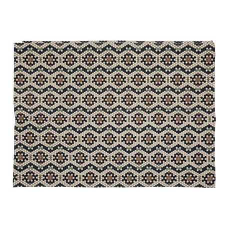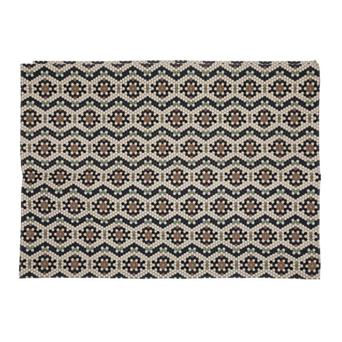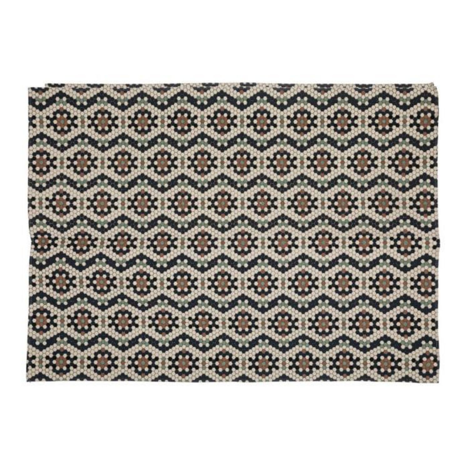 Informations Techniques : Dimensions : L. 170 x l. 120 x H. 1 cm Matière : 100% Coton Spécificités : Pratique & Utile Tapis déco Motifs géométriques Lavable en machine Forme rectangulaire Poids : 1,67 kg Couleur : Multicolore