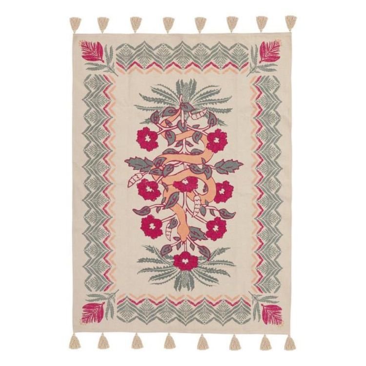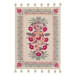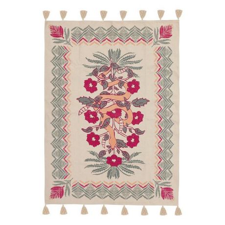 Informations Techniques : Dimensions : L. 170 x l. 120 x H. 1 cm Matière : Coton (800 g/m2) Spécificités : Déco & Coloré Tapis rectangulaire Motifs floraux Avec pompons à franges Lavable à la main à 30° Poids : 1,67 kg Couleur : Multicolore
