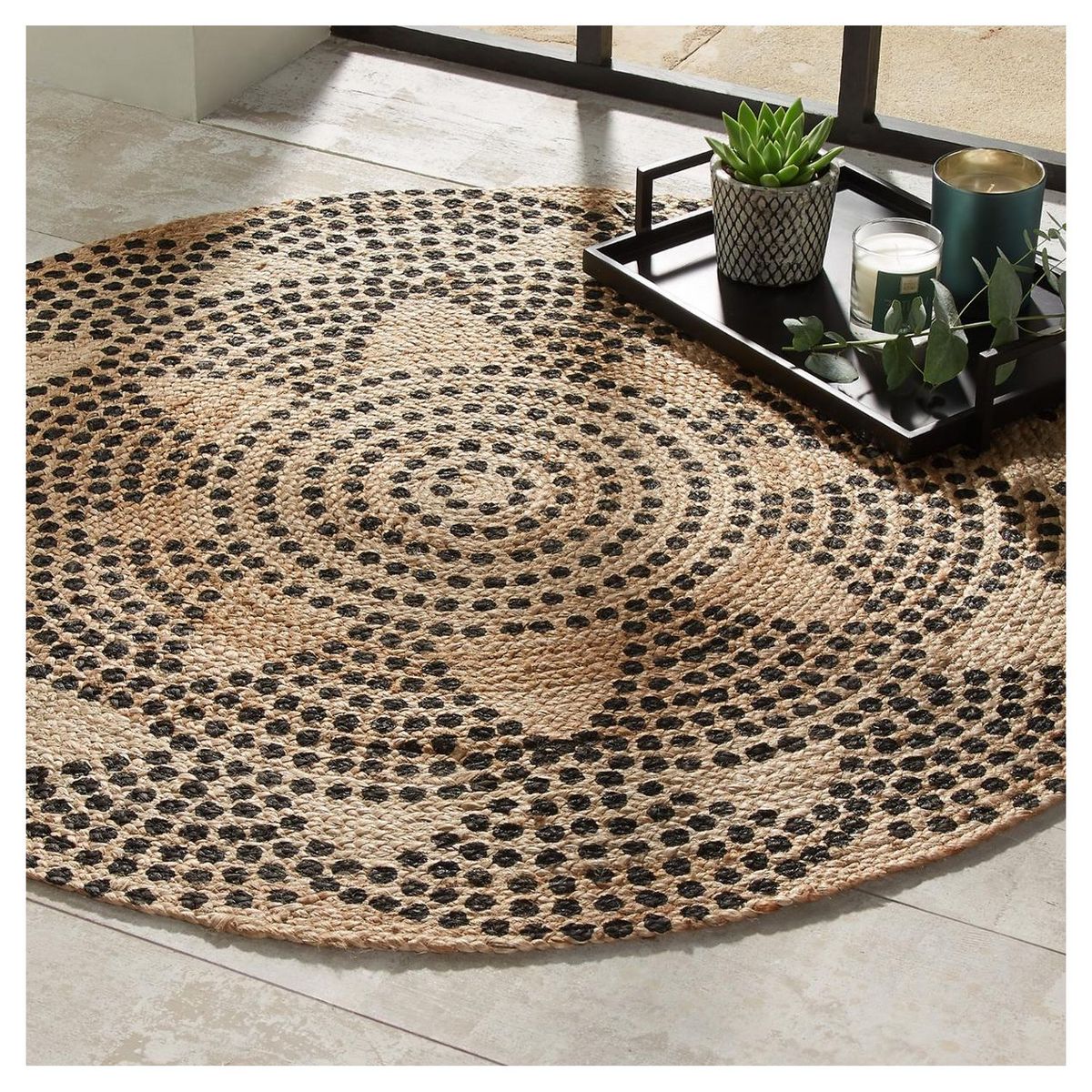 Tapis déco rond en jute imprimé motifs rosace pois diamètre 120 cm