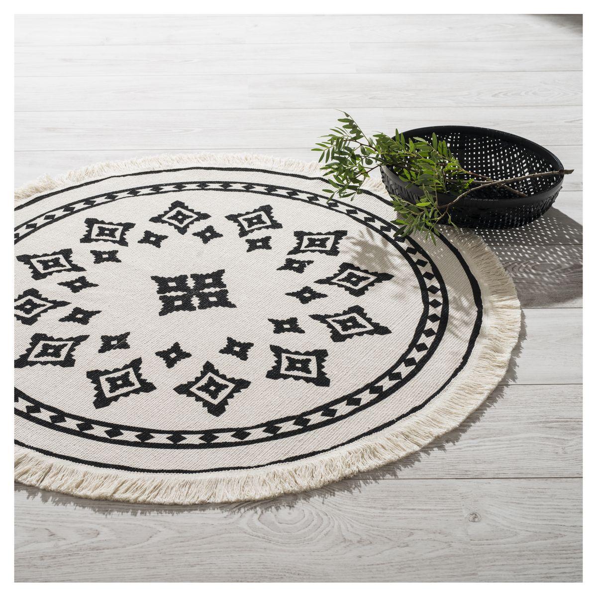 Un tapis tout rond imprimé d'un superbe motif d'esprit ethnique et bordé de franges. Tout le charme du coton travaillé dans un esprit artisanal pour une déco authentique pile dans la tendance ! Entrée, chambre, salon... il trouve sa place partout dans la maison en apportant ce petit "supplément d'âm