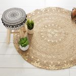 Authentique et chaleureux, un tapis tout rond réalisé en jute rehaussé d'un motif doré... on adore cette association nouvelle et super déco ! Une belle matière végétale 100 % naturelle pour un tapis qui se sent bien partout, dans une entrée, une chambre ou au salon !