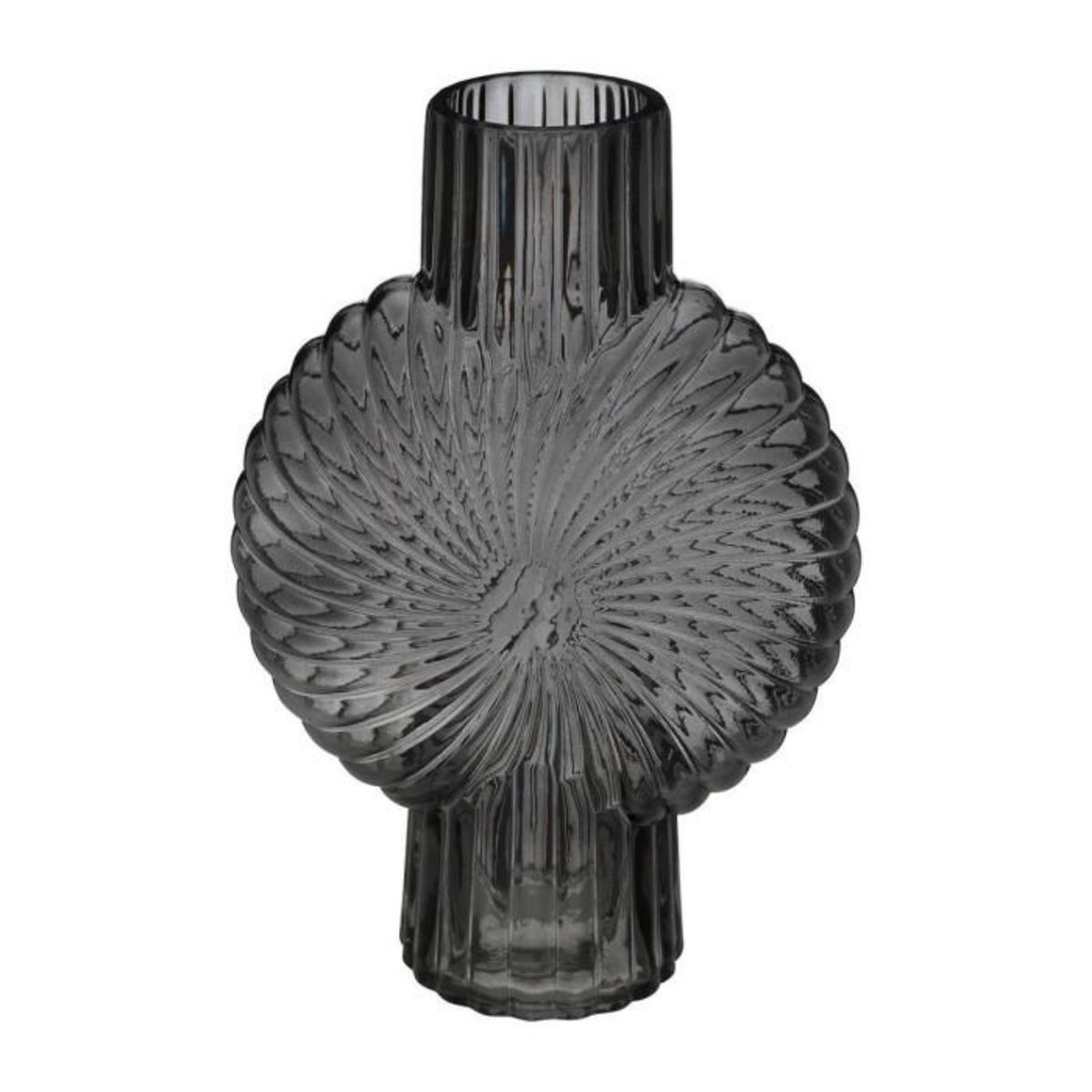 Informations Techniques : Dimensions : L. 21,5 x l. 10,5 x H. 32 cm Matière : Verre Spécificités : Pratique & Déco Vase design coquillage Forme ronde Poids : 1,47 kg Couleur : Gris