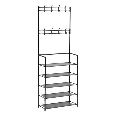 Informations Techniques : Dimensions : L. 60 x l. 25,5 x H. 170 cm Matières : Polypropylène & Acier Spécificités : Utile & Pratique Vestiaire d'entrée avec 5 étagères 8 patères ajustables et amovibles Entretien facile À monter soi-même Capacités : 15 paires Poids max supporté : 15 kg Poids : 1,21 kg