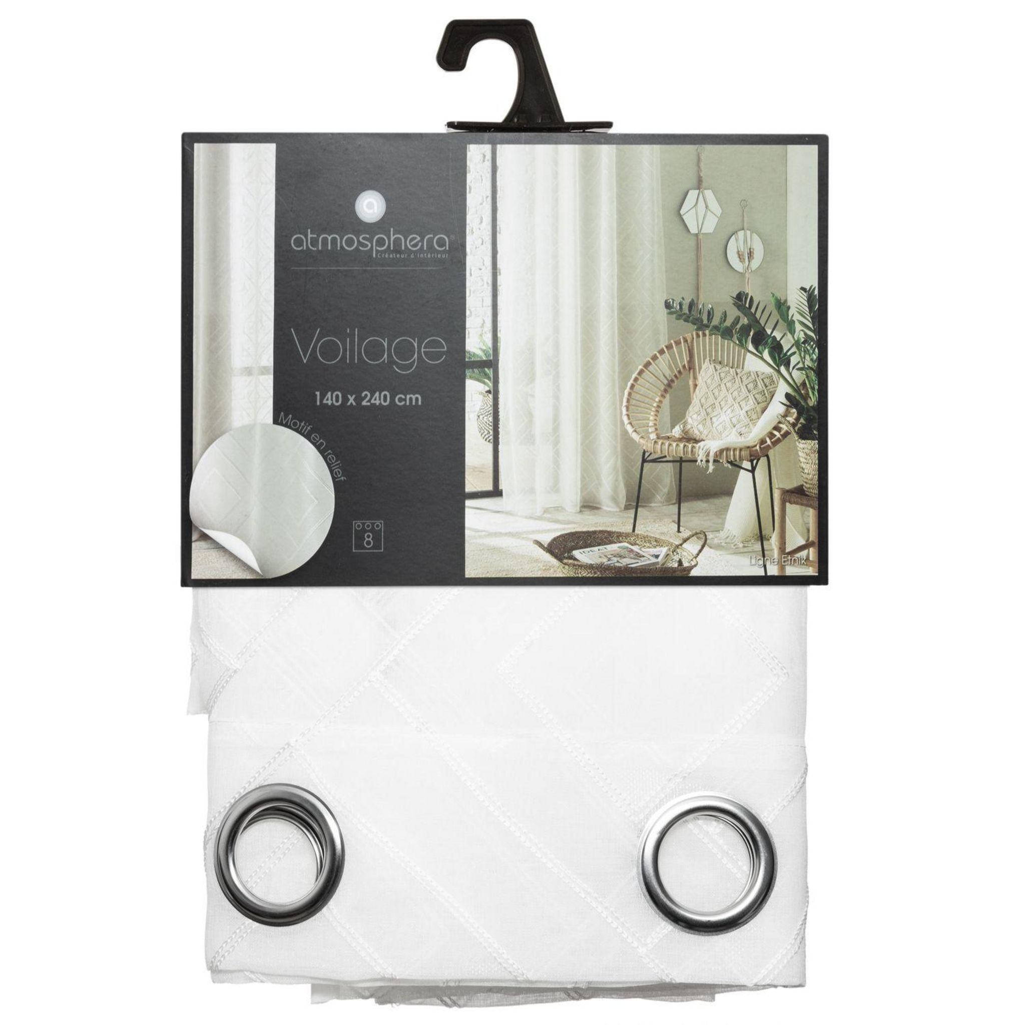 Apportez une touche de couleur à votre pièce avec ce voilage. Son design saura mettre en avant la décoration de votre intérieur.FICHE TECHNIQUE- Voilage d'intérieur.- Tissus en polyester.- Œillets en fer.- Type d'accroche : 8 œillets.- Couleur : Blanc.CARACTERISTIQUES TECHNIQUES- Dimensions : Largeu