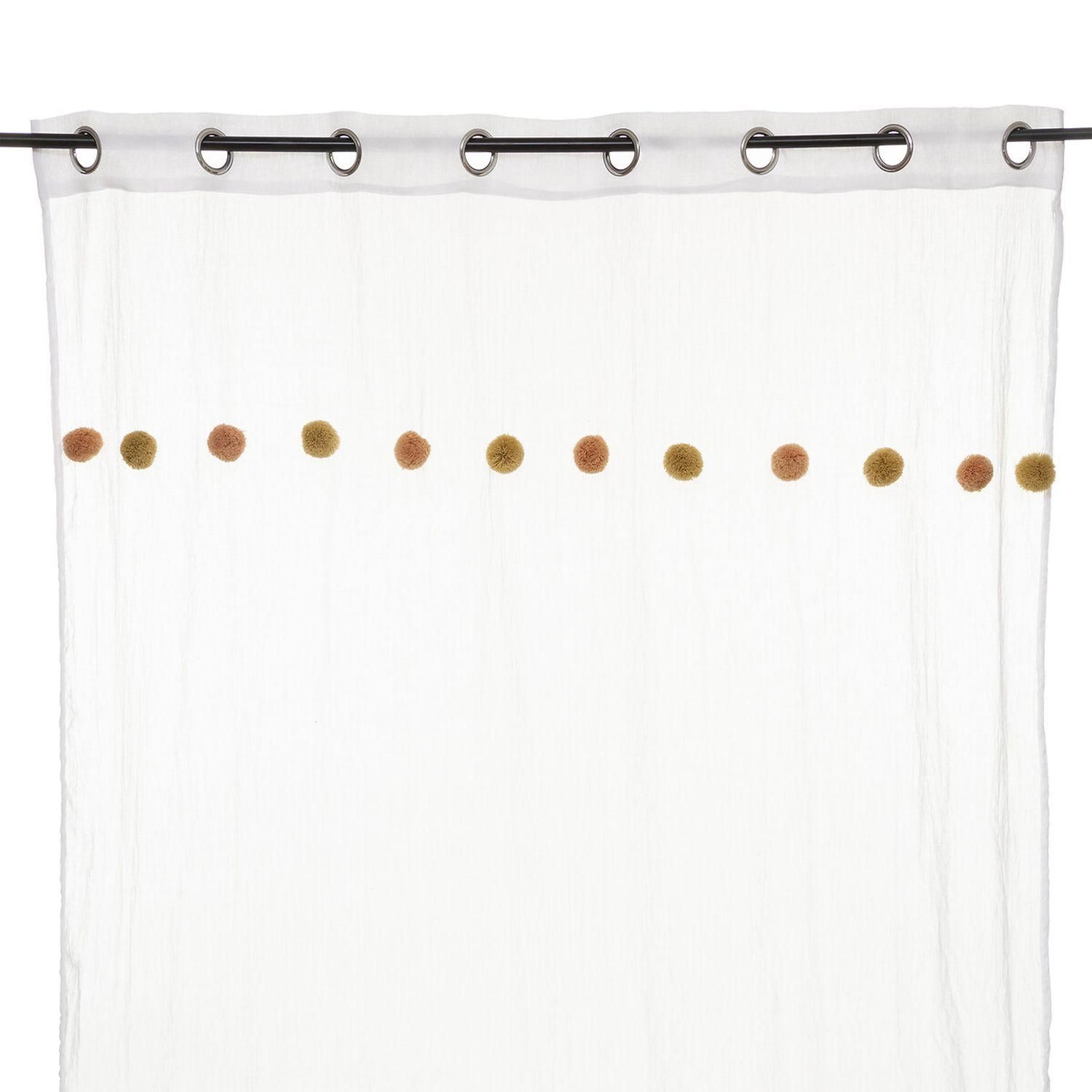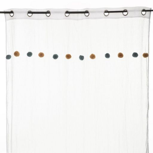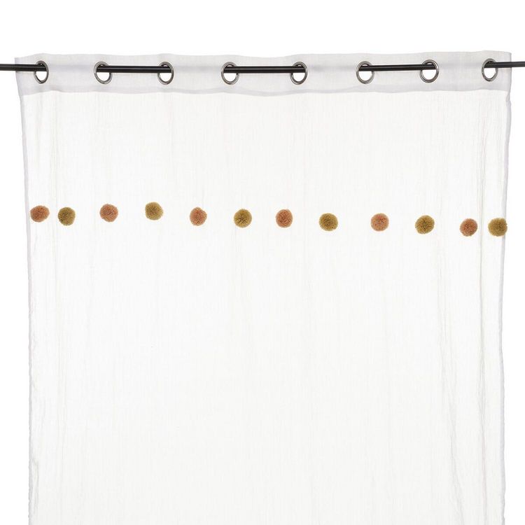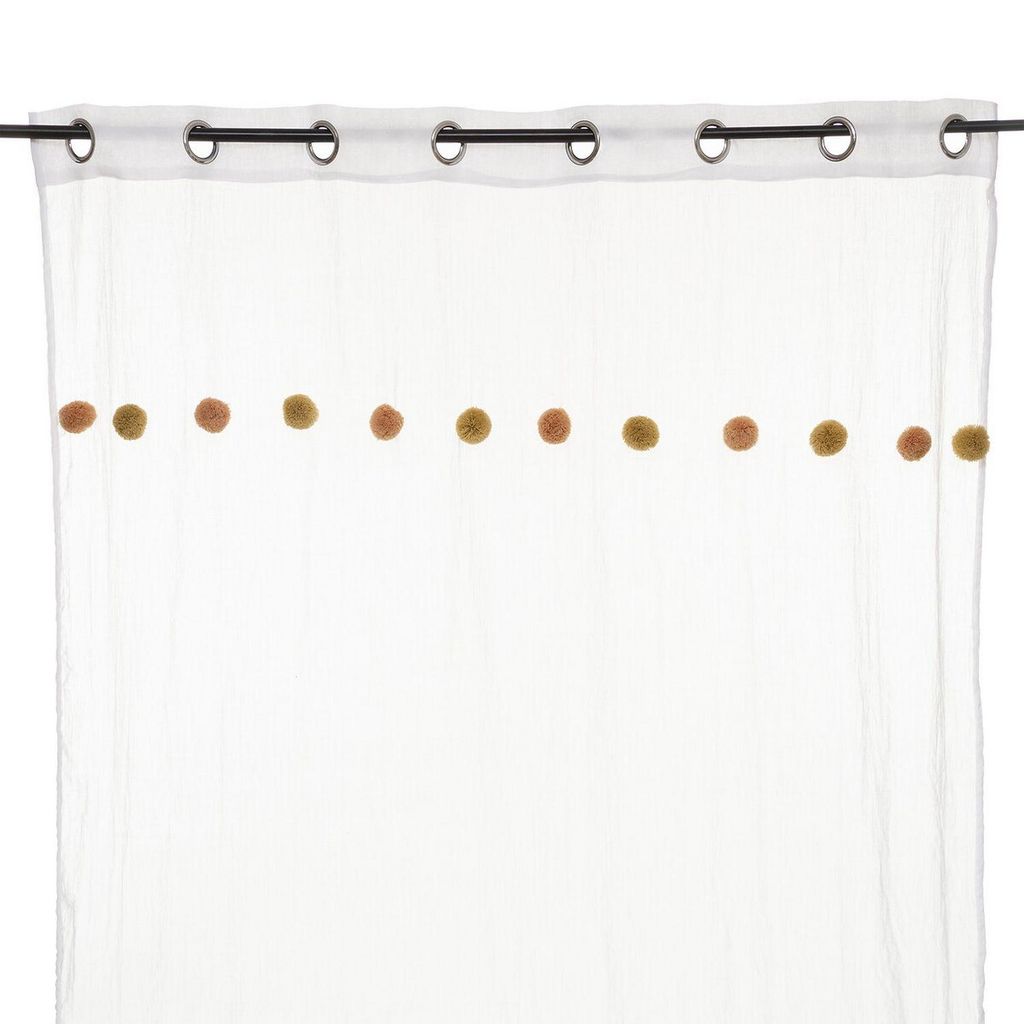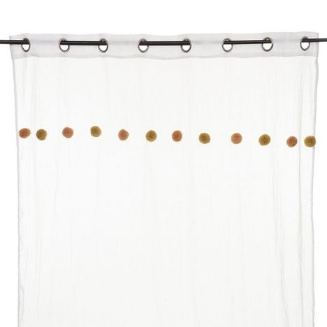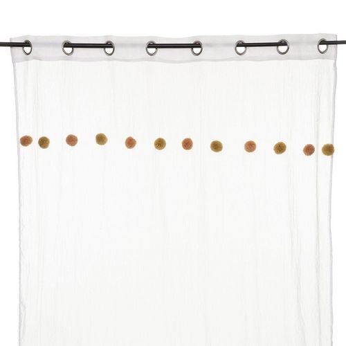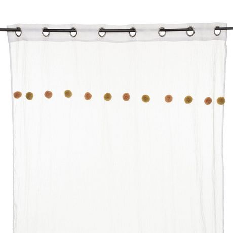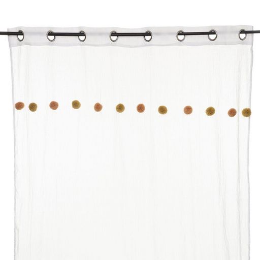 Apportez une touche de couleur à votre pièce avec ce voilage. FICHE TECHNIQUE- Voilage d'intérieur crème.- Tissu et Pompons en Polyester et Coton (65 g).- Voilage non occultant.- Type d'accroche : 8 œillets.- Pompoms : couleur Rose et ocre.CARACTERISTIQUES TECHNIQUES- Dimensions : Largeur 140 cm x E