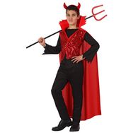 7/9 ans (122 à 134 cm) - Ce produit contient :1 haut noir avec plastron rouge à paillettes et col rouge 1 pantalon noir 100% polyester 1 serre-tête à cornes imitation velours rouge1 cape rouge à velcro Age minimum : 4 ans