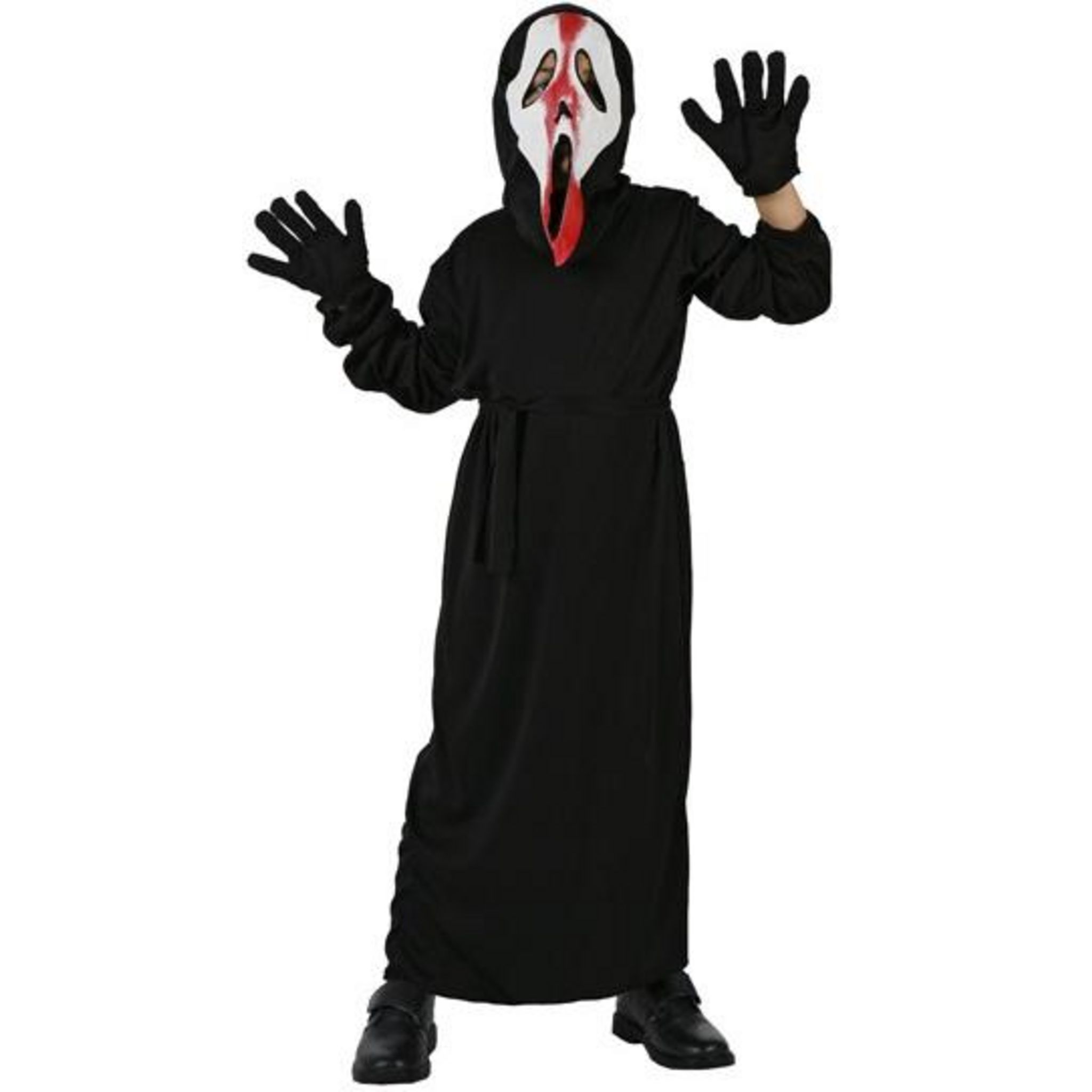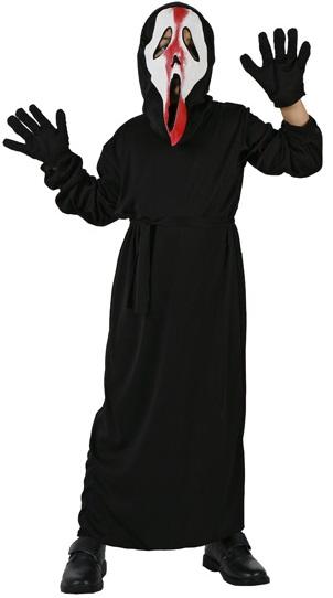 7/9 ans (122 à 134 cm) - Ce produit contient :1 robe noire à manches longues et velcro - 100% polyester 1 paire de gants noirs courts1 ceinture noire1 masque cagoule fantôme ensanglanté Age minimum : 4 ans